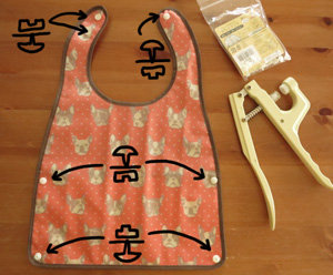 この↓プラスナップつけには穴空け用に目打ちと、スナップをとめ付けるための打ち具(ハンディプレス)が必要になります。