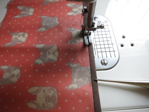バイアステープの端あたりに数針ミシンをかけて、これから周囲をパイピングする際に2枚がずれないように固定しておきます。