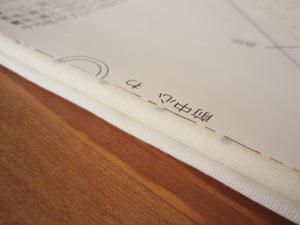 まち針は、なるべくぬいしろの部分を指すようにしておくと、仕上がったときに針穴が残らないのできれいです。