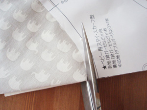 6枚の生地を1度に切るので少々力がいりますが、型紙にそって丁寧に裁断してください。