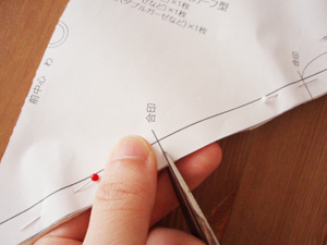 ↓の写真のように、合印のところにある線の縫い代部分に、ハサミの先を使って0.3〜0.5cmくらいの切り込みを入れていきます。