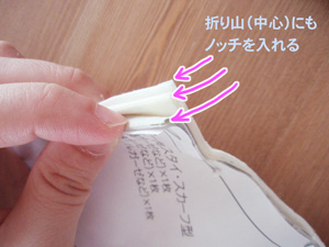折り山は前中心になるので、この部分も忘れずに1枚ずつノッチ(切り込み)を入れてください。