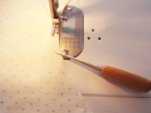 前中心のノッチからスタートして、途中のノッチもずれないように目打ちで押さえながらミシンをかけます。