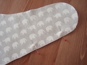 縫い始め、縫い終わりは、型紙にある「返し口」部分になります。この部分をまち針でとめておきます。(↓写真右)