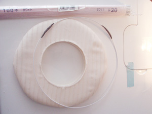 大きくてちょっと入れにくいですが、多少は変形させても大丈夫なので、縁の縫い代にはさみこむように、少しずつ丁寧に入れてください。