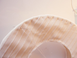 続いて、クラウンとブリムを中表に縫い合わせます。このとき、ブリムは2枚あわせて、クラウンは裏地をよけて、縫い合わせてください。