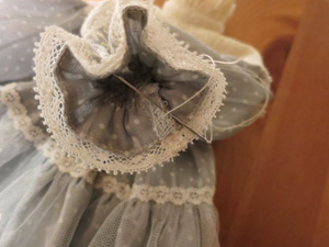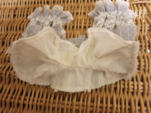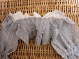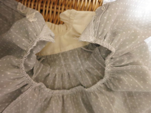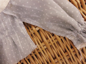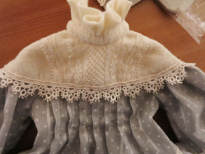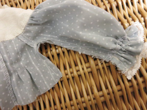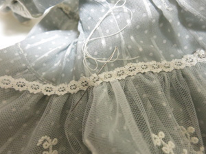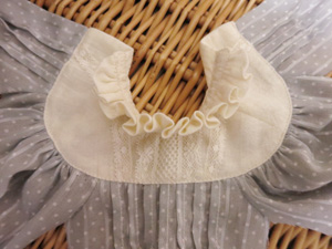 その後、好みでヨーク切替にレースをぬいつけ、タック止まりに飾りビーズをつけ、後ろあき部分にスナップを付けて完成です。