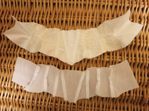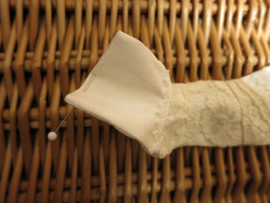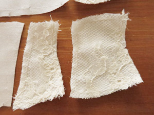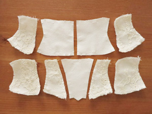 レース地を重ねるパーツは、レースも型紙をあてて1枚ずつ裁断し、表に重ねてぬいしろ上に粗めのステッチでとめておきます。