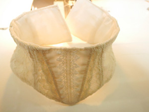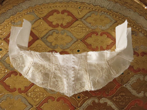 デザイン上↓前中心、後ろ中心のパーツにはレースを重ねずに表地(シルクシャンタン)が見えるようにしています。