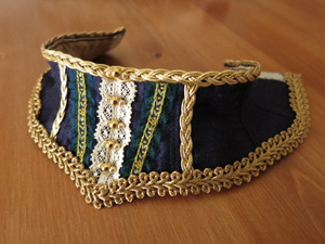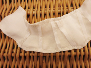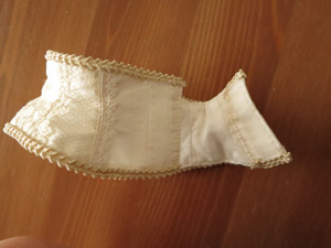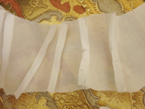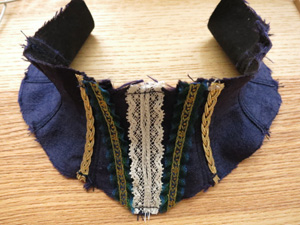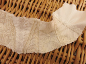 表地はさらにコバステッチやWステッチを切替にそって入れて、飾りのレースもぬい付けます。