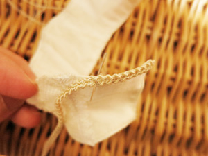 ぬいしろの厚みがあり、針を刺すのにかなり力がいるので、固い台を針に垂直に押し当てる等してぐいっと一針ずつ刺してください。(針を折りやすいので気をつけてください)