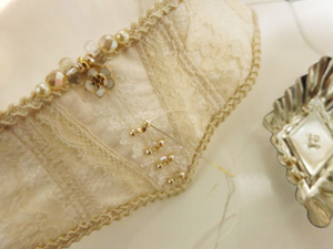 前中心部分に飾りビーズやチャームをとめ付けます。(ビーズ刺繍用の細い針を使用します。)