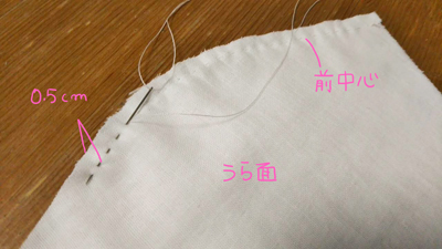 表地、裏地それぞれを中表に重ねた状態で、前中心をぬいあわせます。0.5pのぬいしろですが、0.7pくらいになっても問題ありません。