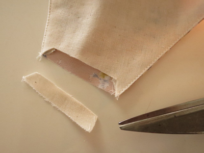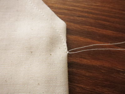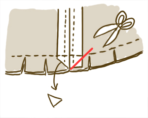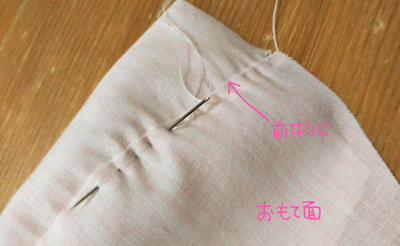 これはミシン縫いでの工程ですが、筒状にして表に返す前に、下記〇印のように、ぬいしろの角を落としておくと、すっきり仕上がります。