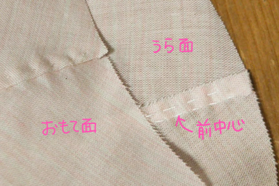 ミシン縫いの場合はこの前中心のぬいしろを割りステッチをかけますが、ここは手縫いなので、片側に倒して、押さえステッチを1本入れておきます。