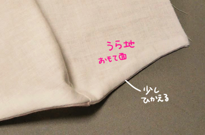 表に返したら、アイロンで形を整えます。端は表地よりも裏地を0.5〜1oほど内側に控えるようにアイロンをかけると、仕上りがきれいです。