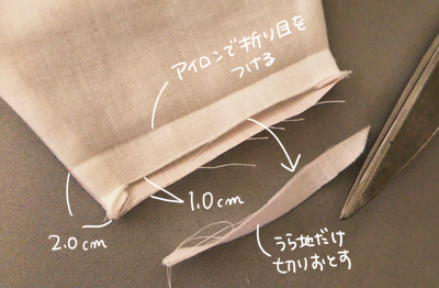 まずアイロンで端から2.0pのところに折り目をつけ、三つ折りが折りやすいように、裏地だけ端から1.0pを切り落としておきます。