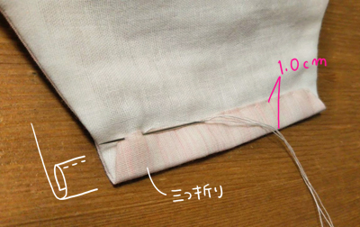 アイロンで付けた折り目で折り、さらに端を内側に0.8p程折り込んで三つ折りにして、ゴムが通せるように1.0pくらいの幅をつくって縫いとめます。