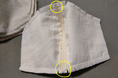 今回は マスクゴムが手に入らなかったので、代用のウーリースピンテープを通しています。