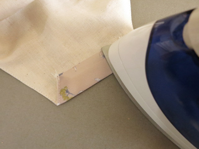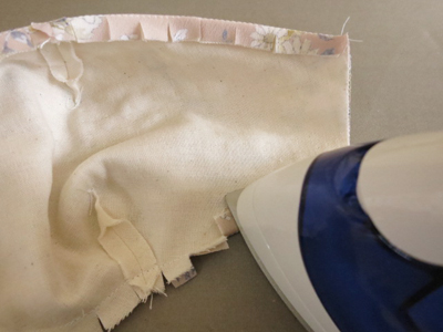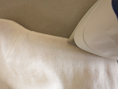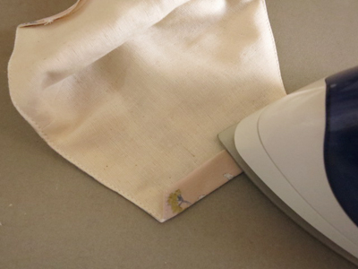 ぬいしろに切込みを入れたら、アイロンを使って出来上がり位置でぬいしろを内側に折り、脇から表に返します。