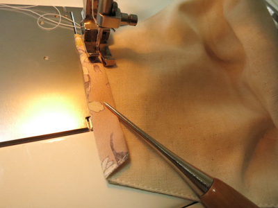 裏地をくるむように表地を三つ折りして、ステッチでとめてゴムを通す部分をつくります。