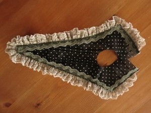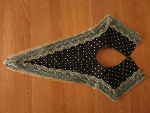 レースをつけた表衿と裏衿を中表に重ねてぬいあわせ、ぬいしろを半分くらいの巾にカットして表に返します。(衿の作り方はこちらも参考にしてください)