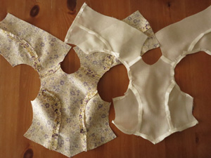 前、後ろそれぞれ脇のパネルラインと肩線を縫い合わせます。