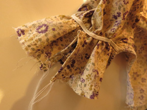 衿は、表衿側にはギャザーをよせたレースを中表に重ねてぬいつけ。裏衿は衿ぐり側のぬいしろを二つ折りにしてステッチで押えておきます。