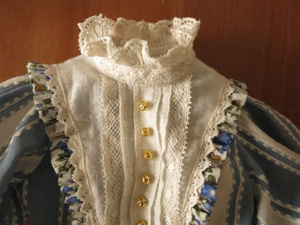 袖口のフリルも別布で作ります。さらにフリルとの切替位置には細巾のトーションレースを上から重ねて手縫いでつけます。