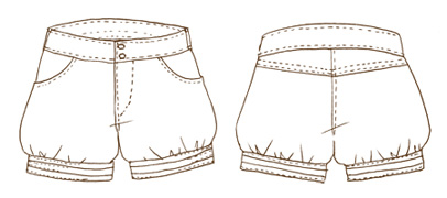 ショートパンツはかぼちゃパンツ風に、裾に少しギャザーが入ります。座らせてもヒップが出ないように、前パンツに対して後ろパンツはかなり股上深めの作りにしています。