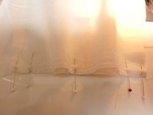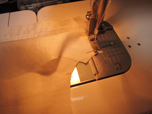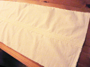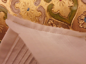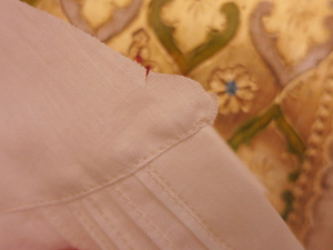 さらに一番外側のピンタックに飾りレースをはさみこみ、たたきつけておきます。