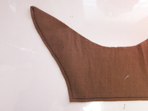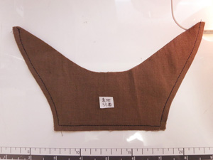 衿は、中表に重ねて周りを縫い合わせ、カーブに切り込みを入れ、さらにぬいしろ巾は2/3くらいの細さにカットし、表に返してアイロンで形を整えます。