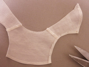 (肩線の余分な縫い代は切り、カーブは切り込みを入れて折り返します。)