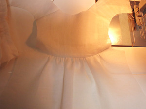 袖も同様に、袖(上)と袖(下)をギャザーをよせて縫い合せます。
