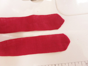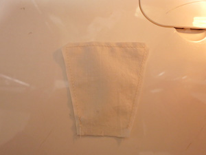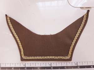 胸当て布は、表側に飾りレースをたたきつけた後、中表に2枚を重ねて縫い返し、返し口(下辺)は手でまつりぬいします。