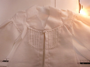 ◇応用デザイン◇ 衿のラインをブレードにして、見頃にU型のヨークを入れたバージョンです。左袖の切替ラインには配色テープ(細幅の焦げ茶綿レース)を使用。 ヨーク切替のパターンはセットに含まれていませんので、アレンジ参考作品としてご覧ください。 パターンは、U型ヨークが入る以外は全く同じです。 |
