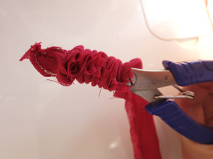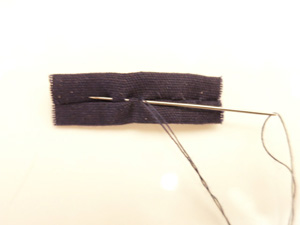 スカーフとめ布は飾りテープをつけたら筒状にして裏側を手でまつり、さらにもう一度、今度は横にくるっと巻いて筒状にし、縫い代がほつれないよう