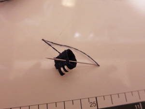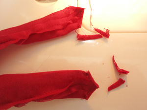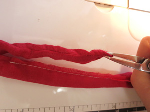 スカーフは中表の筒状にして縫い合せたら(この縫い代は割ります)、中心の返し口からペンチを使って表に返します。