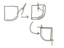 U型のピンタック入ヨークは、右図のように角丸部分をぐしぬいして形を整え、みごろの上からたたきつけています。