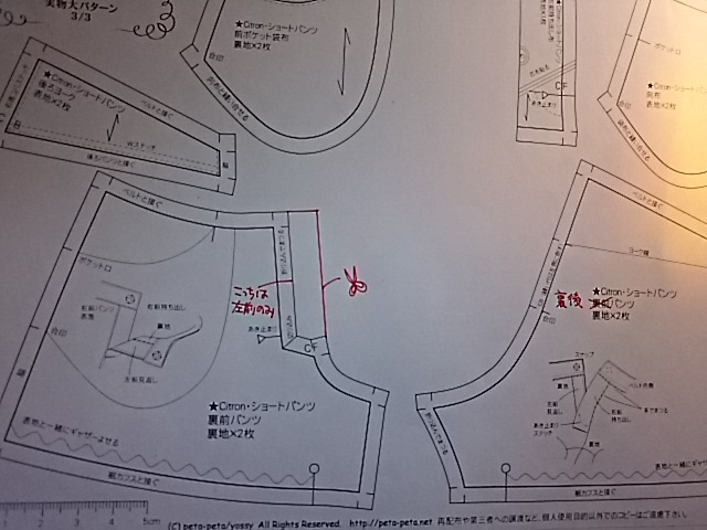 ・裏前パンツの前中心の形状が、左裏前パンツのみの形状となっていました。左右2枚一緒に裁断するパターンなので、