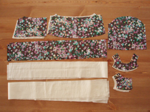 0,はじめに 1,下段フリルにレースを付ける 2,ギャザーをよせて下段フリルと裏裾フリルを接ぐ 3,みごろとヨークを接ぐ 4,袖をみごろと縫い合わせる 5,袖下〜脇を縫い合わせる 6,みごろと裾フリル 7,後ろ中心〜えりぐり 8,仕上げ