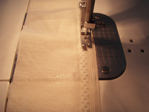 生地の表面にレースを中表にのせて、レースの出幅をそろえ、パターン上の仕上がり線の位置でミシンをかけます。