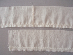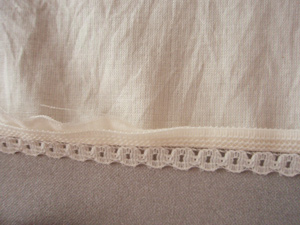レースを付ける前に三つ折りステッチをかけてから、表側からなるべく手縫いでレースをつけるようにすると良いです。