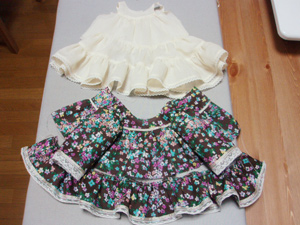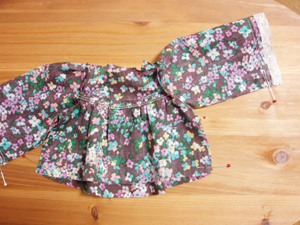 0,はじめに 1,下段フリルにレースを付ける 2,ギャザーをよせて下段フリルと裏裾フリルを接ぐ 3,みごろとヨークを接ぐ 4,袖をみごろと縫い合わせる 5,袖下〜脇を縫い合わせる 6,みごろと裾フリル 7,後ろ中心〜えりぐり 8,仕上げ