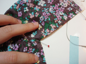 脇の下は、接ぎ目がずれないようにしっかりピンですくって止めます。袖口は、レースがはみ出している場合は、レースよりも袖の生地の袖口をそろえて、ピンを打っておきます。