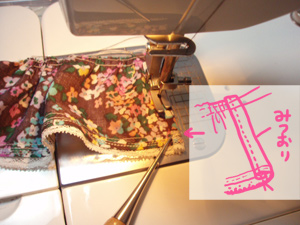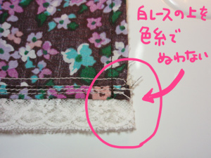 そしてミシンで一気に縫います。このとき、糸の色がレースの色と違う場合は、レースの上は縫わず、袖口の生地のところで返し縫いをします。白レースのところは、後で白い糸を使って手縫いで縫い合わせます。本当にちょっとした部分ですが、ここで気をつけると仕上がりがきれいに見えるとおもいます。