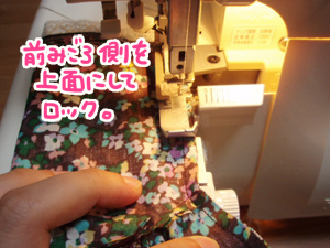ここは、この後縫い代を後ろ見頃側に倒すので、前見頃側を上にしてロックをかけます。