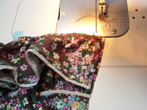 うすい生地でギャザー多めのフリルを接ぐと、下側の生地にしわが出来て、ロックミシンでまきこんでしまいやすいので、少しずつ、下に指を入れて平らにならしながら、ロックをかけます。