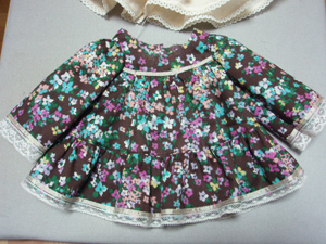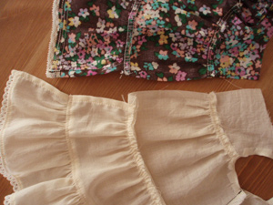 0,はじめに 1,下段フリルにレースを付ける 2,ギャザーをよせて下段フリルと裏裾フリルを接ぐ 3,みごろとヨークを接ぐ 4,袖をみごろと縫い合わせる 5,袖下〜脇を縫い合わせる 6,みごろと裾フリル 7,後ろ中心〜えりぐり 8,仕上げ