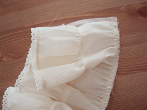 SD少女サイズ フリルワンピースの作り方(6、みごろと裾フリルを縫い合わせる)